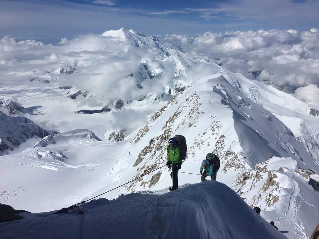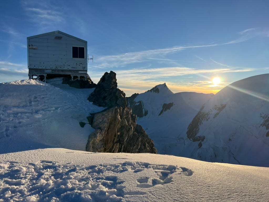 Borrowing Morgan’s puffy jacket because I was freezing climbing Mont Blanc with her. She was locked in and I was in survival mode trying to stay warm. We stopped in the emergency shelter at about 13,000ft to get out of the wind for a bit and that helped.